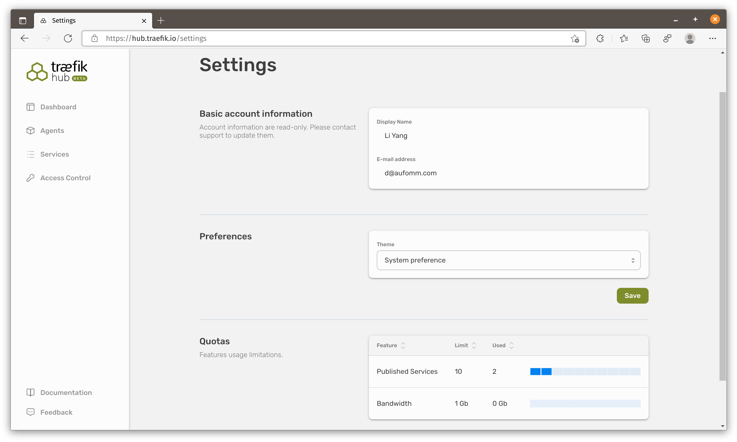 The Quotas section in settings suggests Traefik might want to charge users for the number of services and bandwidth.