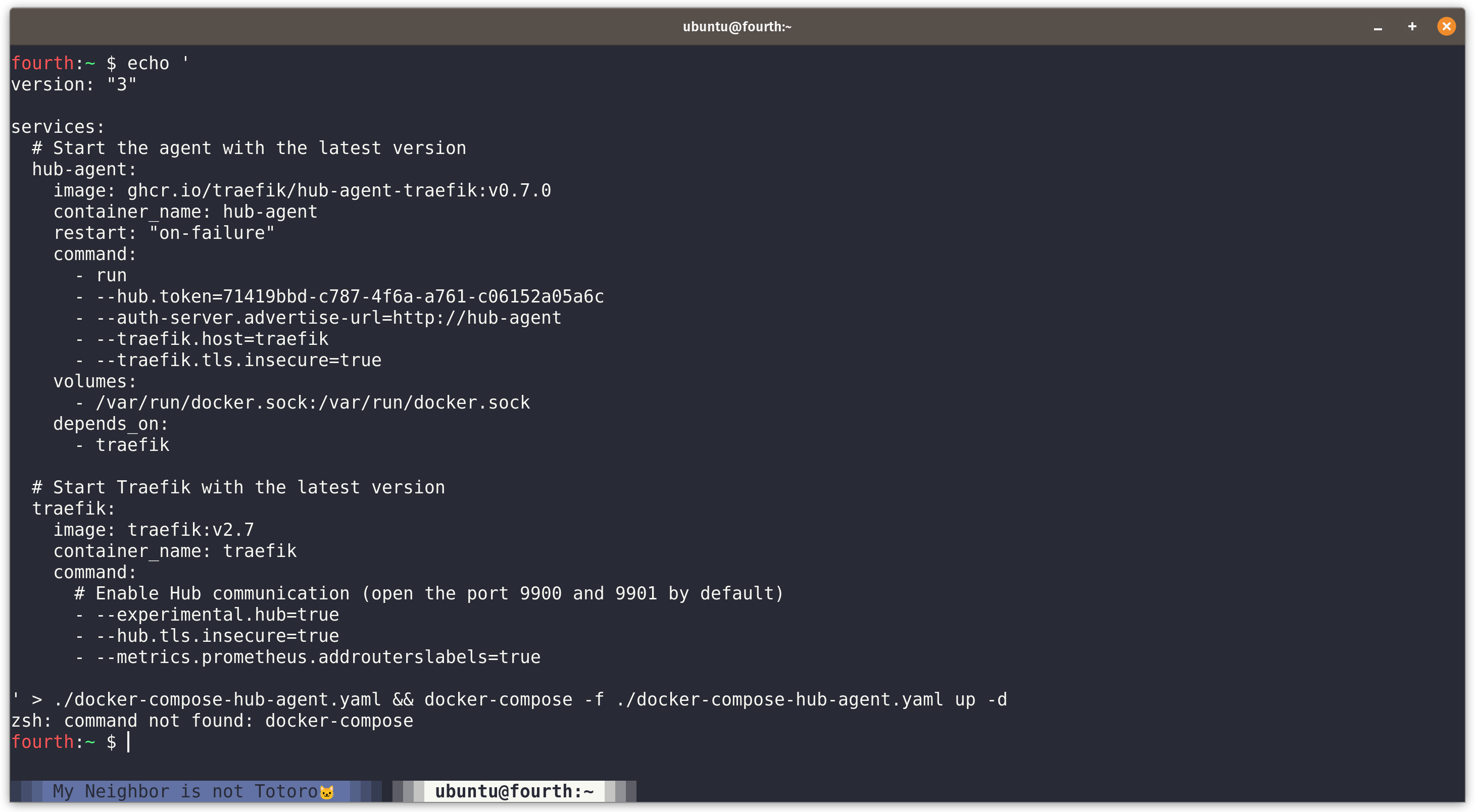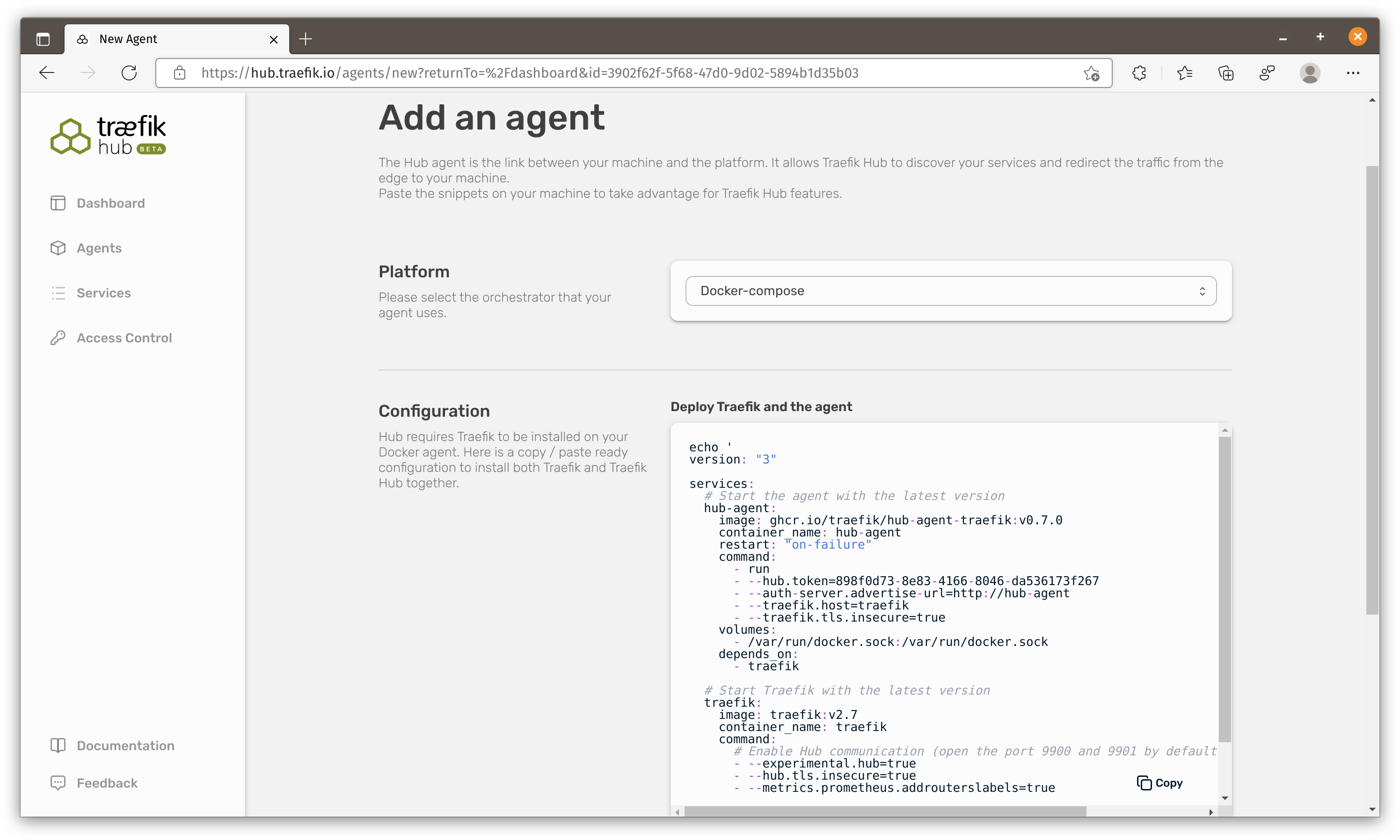 Let’s copy the script and run it on our Virtual Machine. This command saves docker-compose-hub-agent.yaml to current folder and run docker-compose command to start both containers.