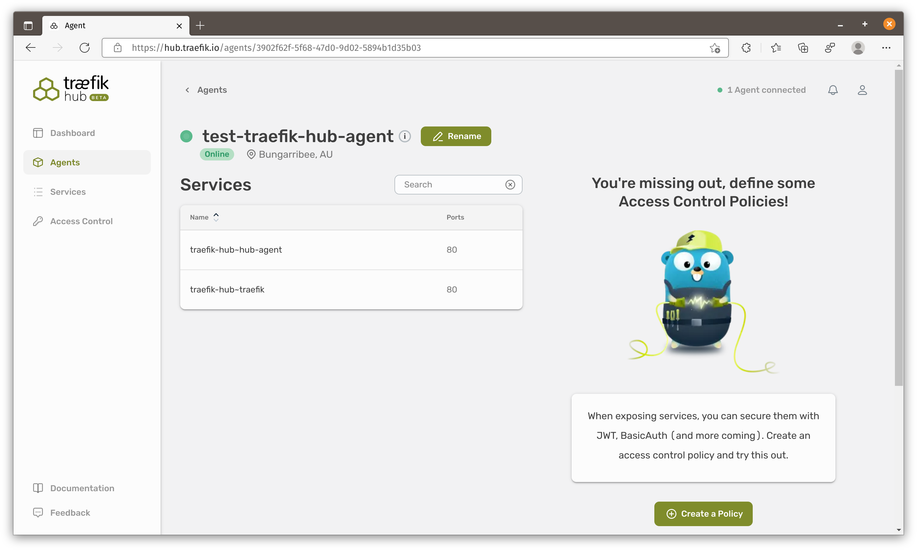 In the agent details and we can see it finds these 2 containers. We can also create policies to be applied on services connected to this agent.