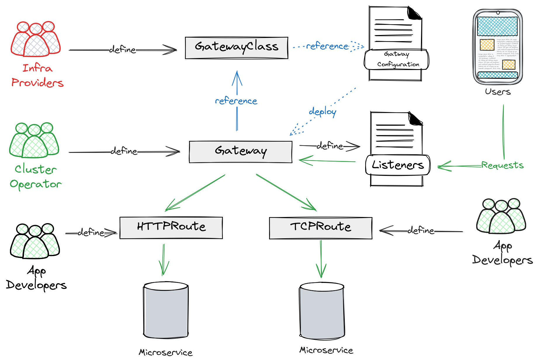 To address these limitations, Gateway API has been introduced. It exposes a more versatile proxy API that supports multiple protocols beyond HTTP and models various infrastructure components. This offers enhanced deployment and management options for cluster operations. Roles and personas also play a crucial role in Gateway API, delineating distinct responsibilities for different teams within the system.