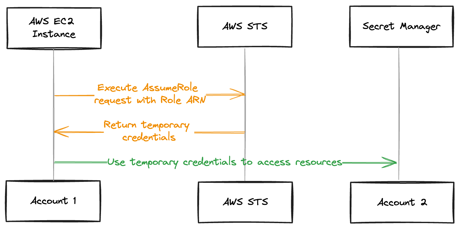 In Account 1, IAM assigns a role (let’s call it Role 1) to an EC2 instance. This EC2 instance can then use Role 1 to assume a role in Account 2 (Role 2). Once the assumption is successful, the EC2 instance can use the temporary credentials from the returned response to access resources in Account 2.