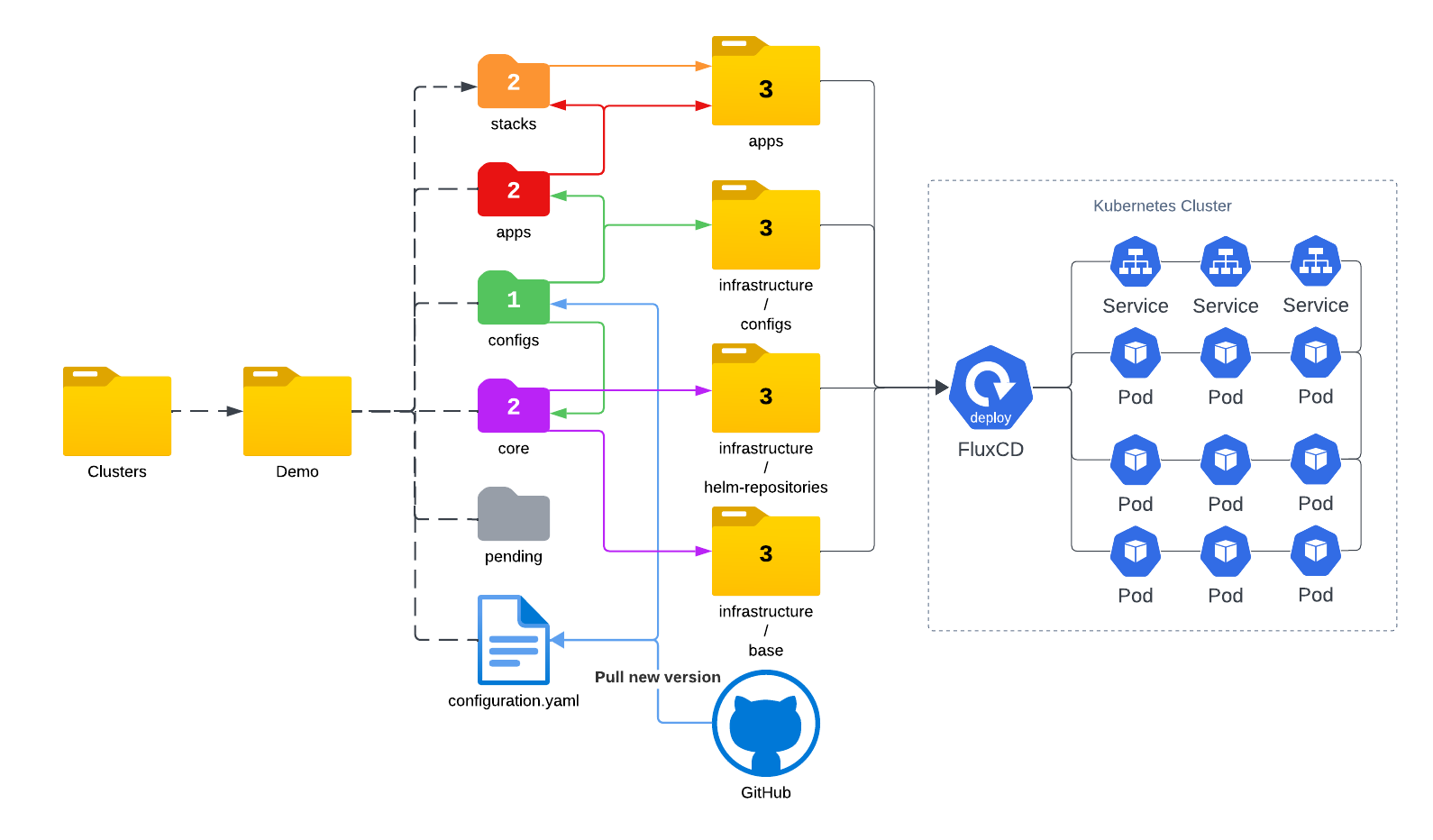 In this article, I aim to present the approach I employ for the declarative management of my home lab cluster using FluxCD. I will delve into the intricacies of designing the folder structure, delineate the functions of each directory, and elucidate the process of installing or uninstalling software within my cluster. Once the underlying mechanics of this framework are understood, seamlessly integrating specific units into distinct folders becomes a straightforward task. This empowers you to effortlessly introduce or remove applications through a solitary Git commit, leaving the subsequent orchestration and management tasks in the capable hands of FluxCD.