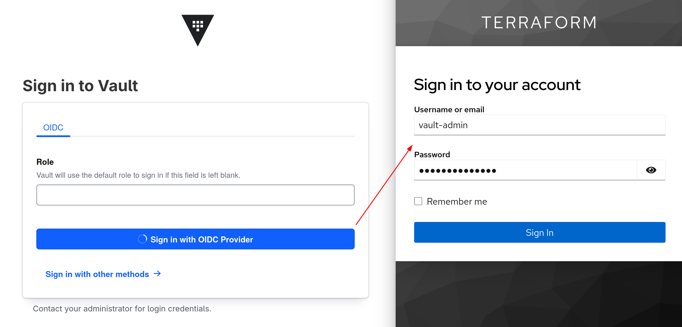 On the keycloak side, create the vault-admin user and make sure the valid_redirect_uris and web_origins are updated accordingly.