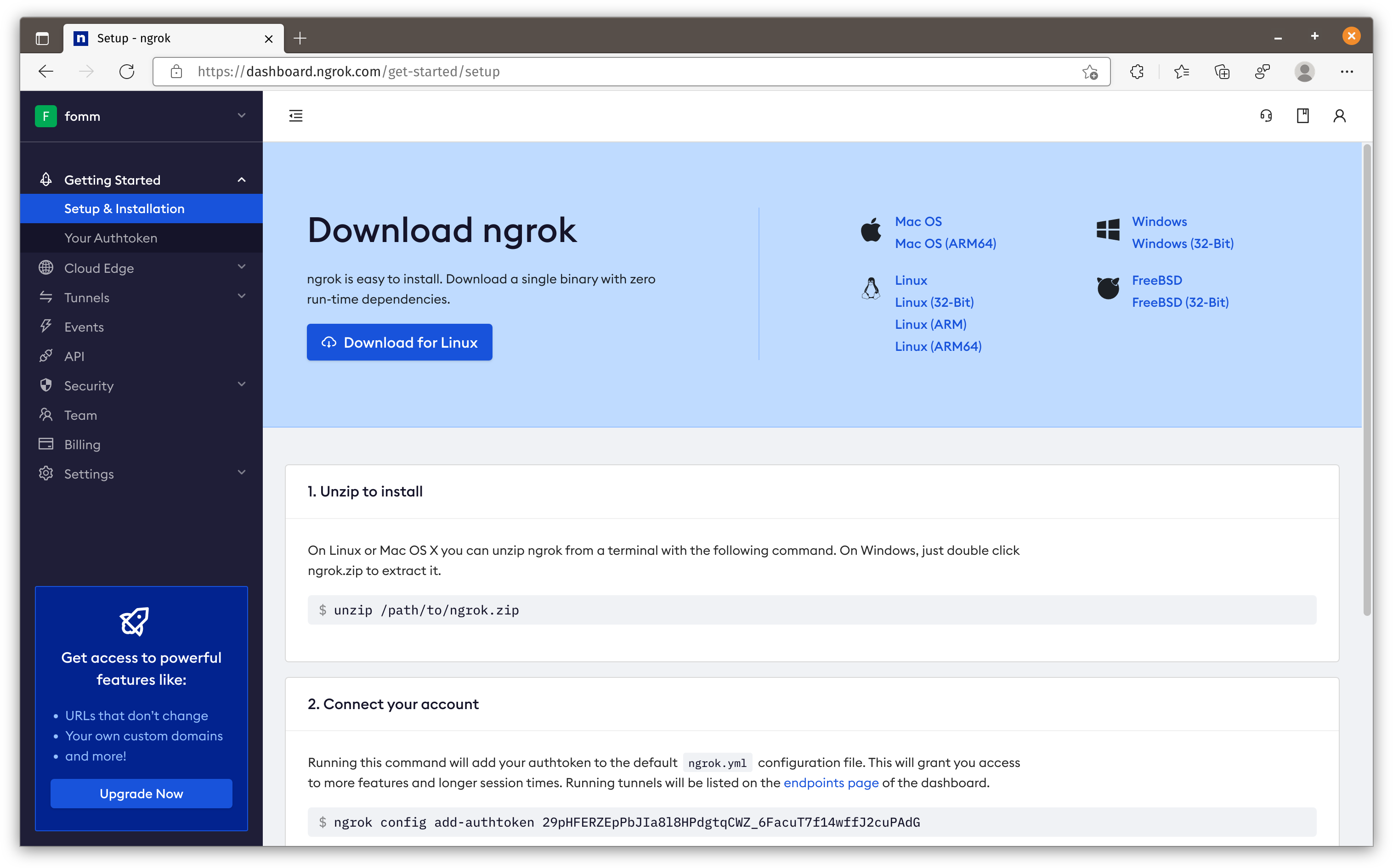 Let’s log in to Ngrok to get the Authtoken. You can see my Authtoken is 29pHFERZEpPbJIa8l8HPdgtqCWZ_6FacuT7f14wffJ2cuPAdG.