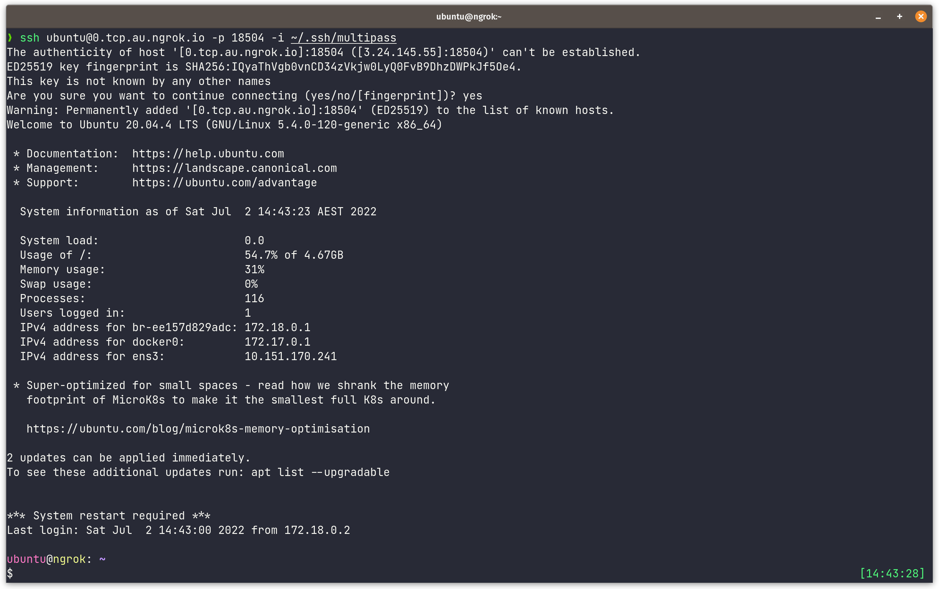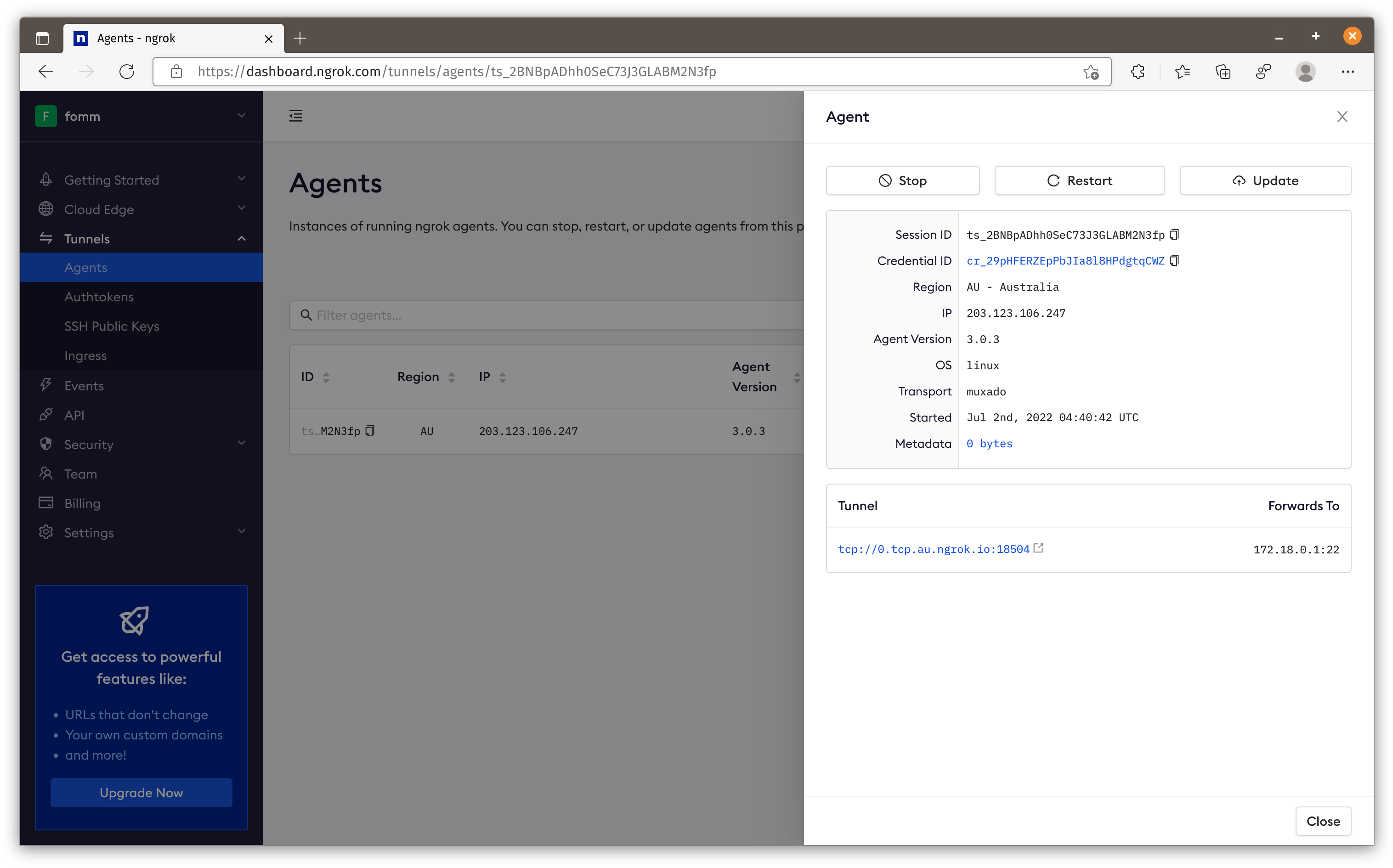 When we come back to dashboard, we can see the tunnel URL becomes tcp://