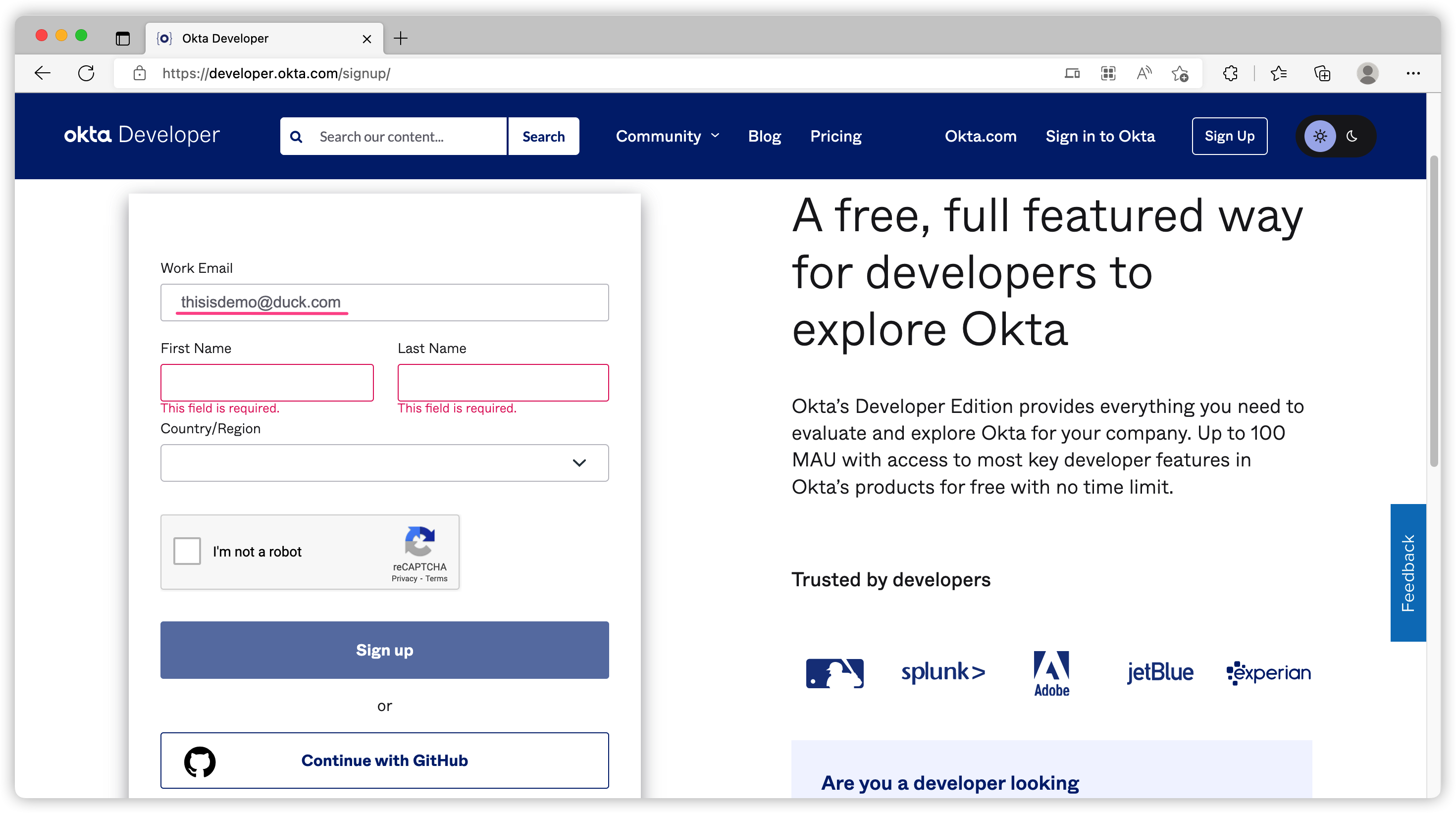You can register a free account at https://developer.okta.com/signup/. The process is pretty easy. What you need is an email that is not from well-known provider. As you can see, it does not complain a duckduckgo email.