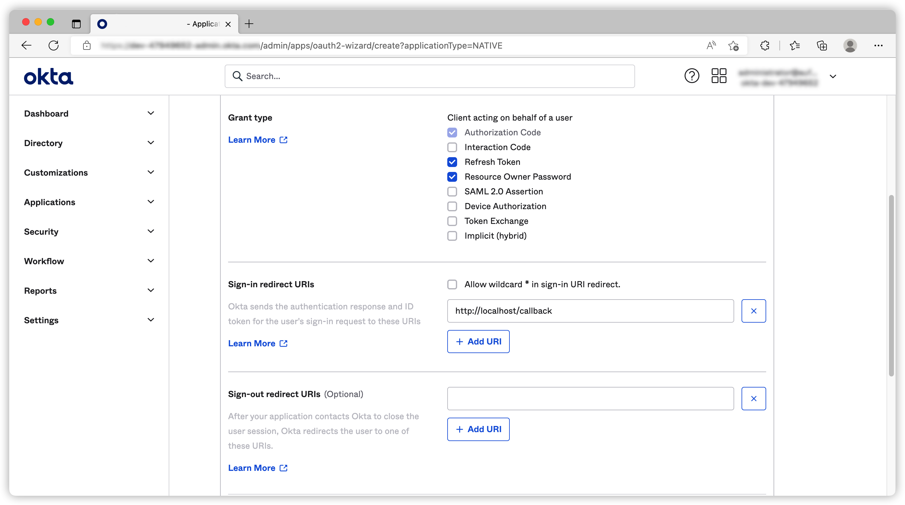 I’ve selected auth code, refresh token and password flow and used http://localhost/callback as Sign-in redirect URIs.