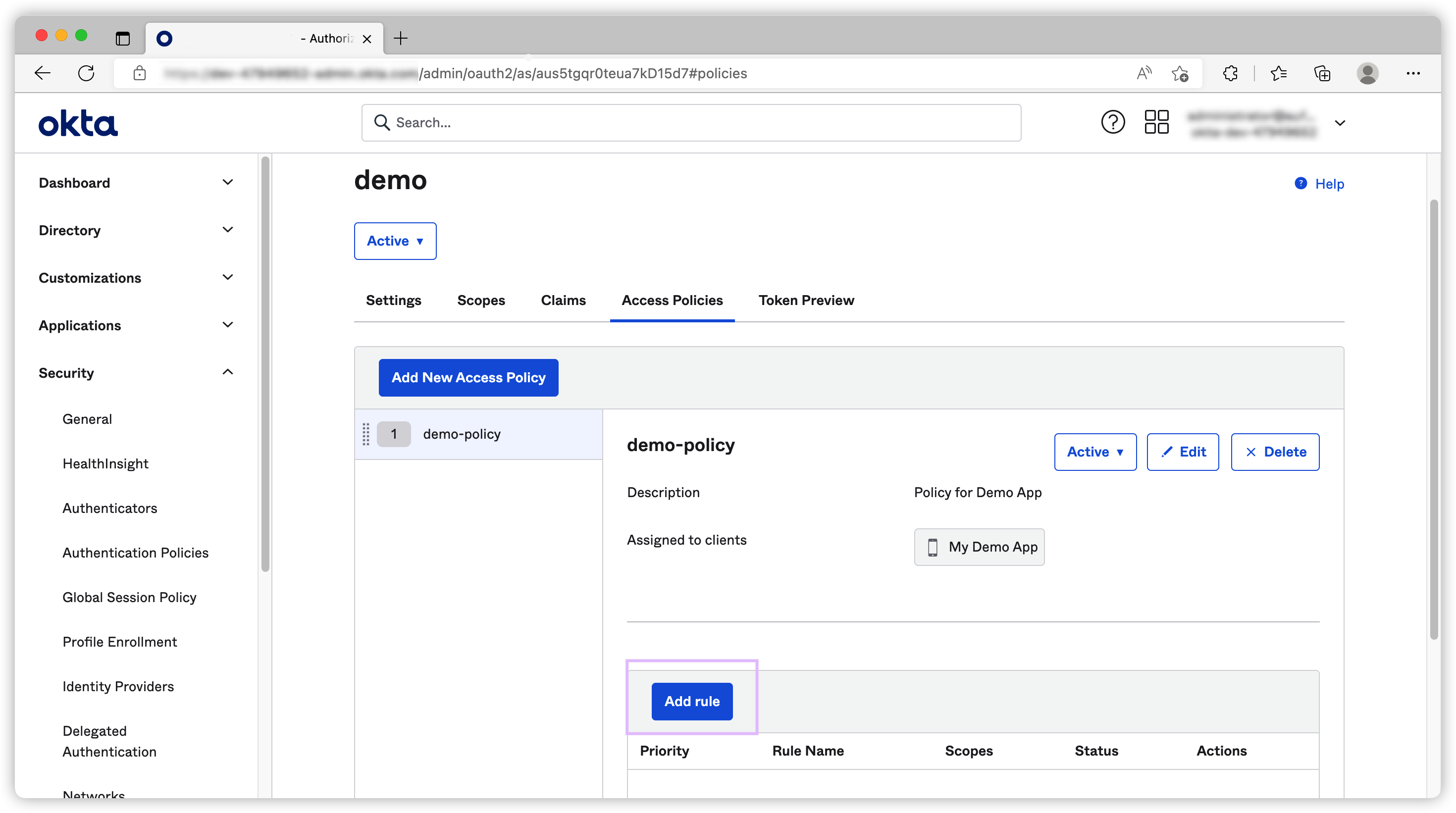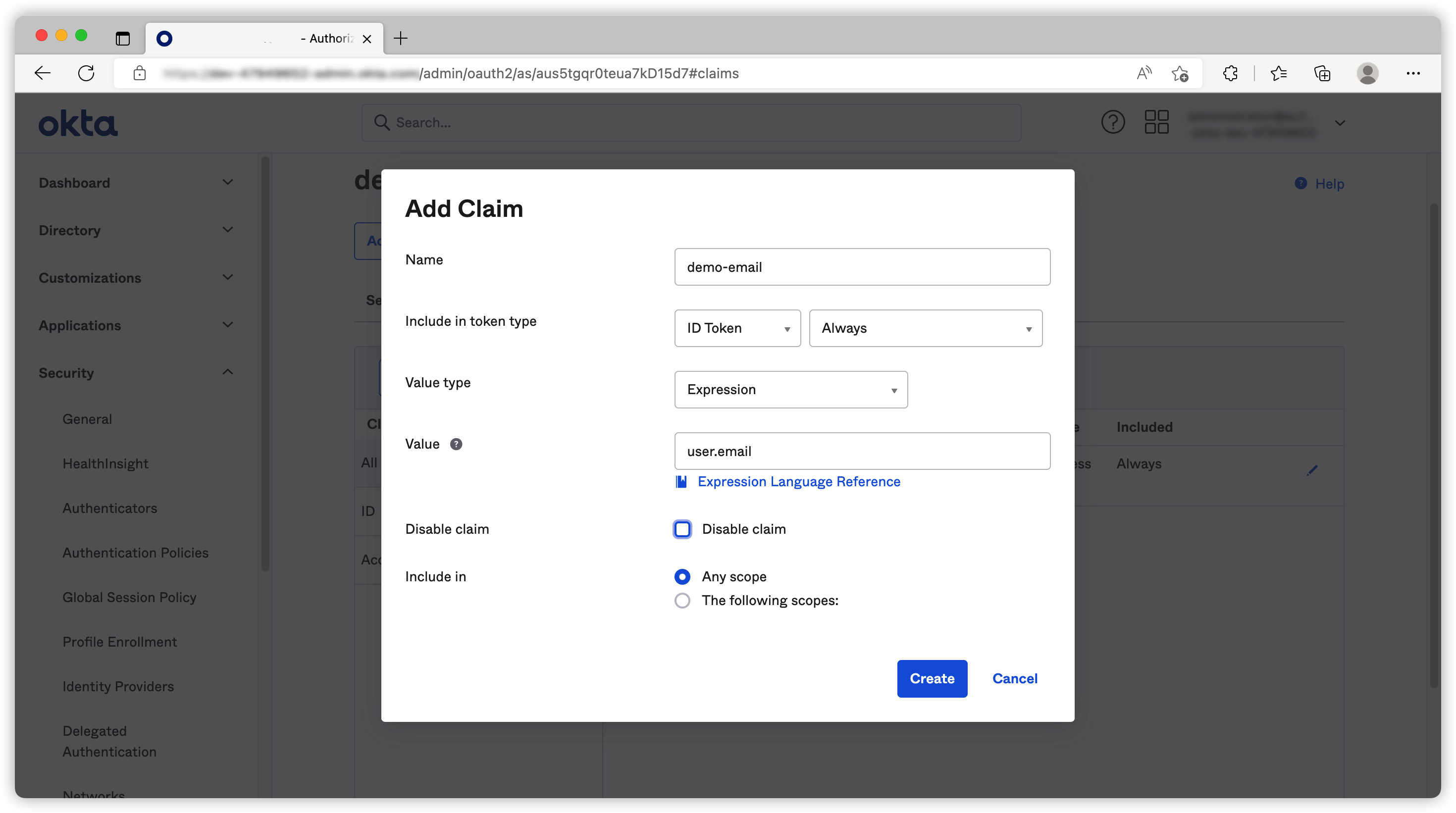 One important feature we need to know is to add scope and claims to our custom authorization server. For example if you want to add user’s email to a custom claim demo-email, you can go to add the claim as below.
