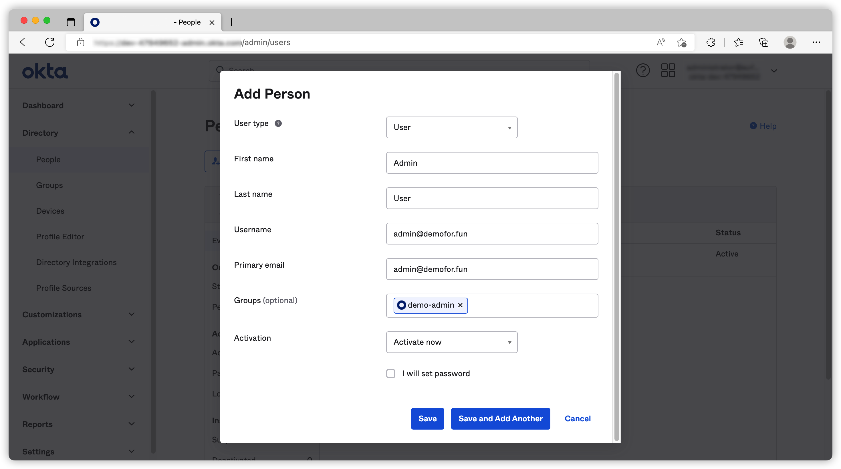 The options are pretty straight forward, normally you would want to let the users to create their own password. I’ve created Admin User, Readonly User and put them in demo-admin, demo-readonly group respectively.